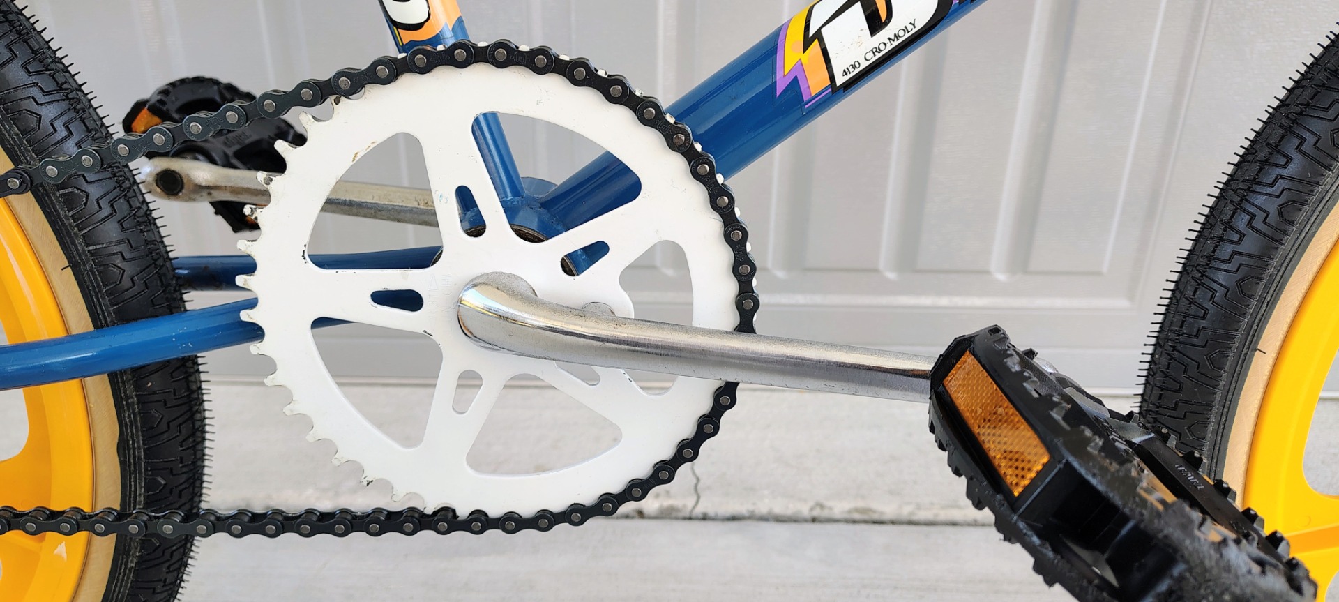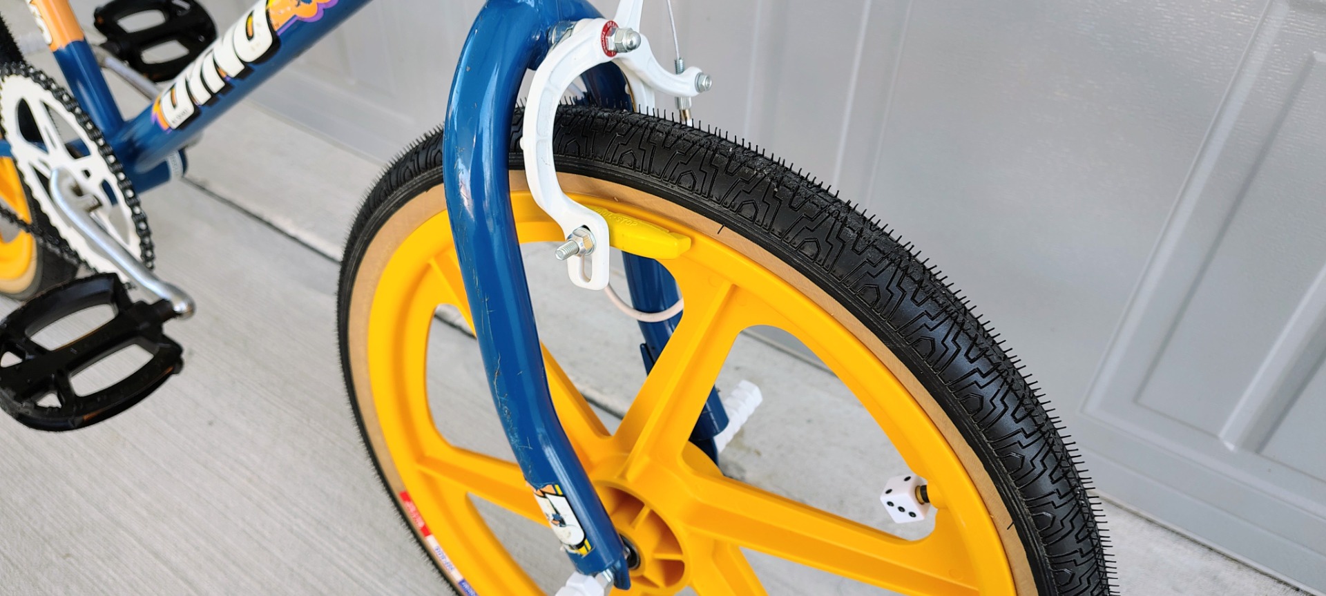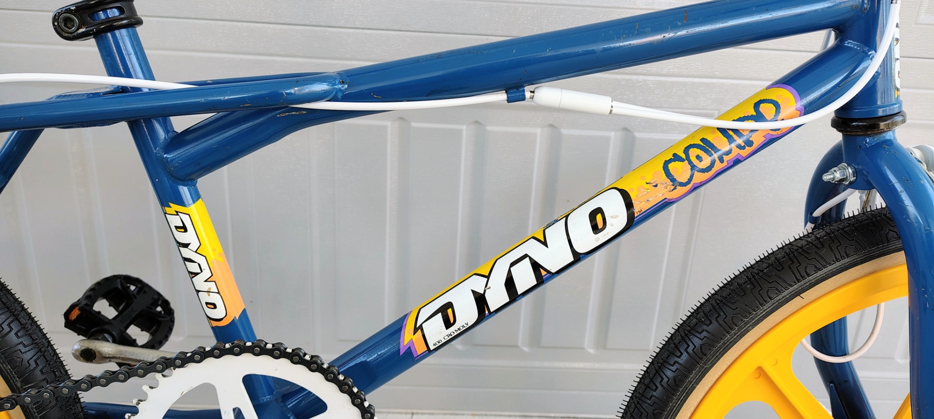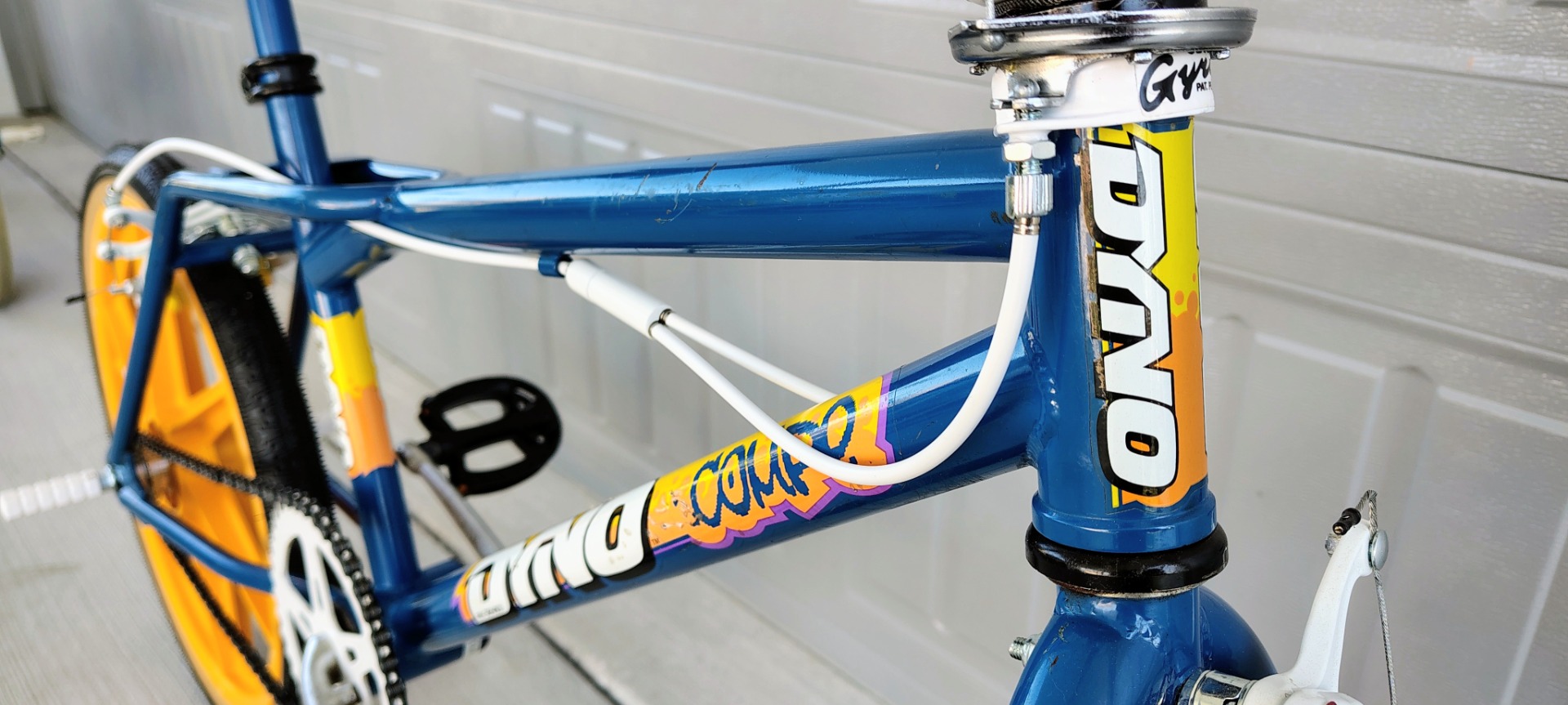 Original frame , fork, bars, paint and decals. NEW Tech 77 locking levers, repop calipers, Odyssey Gyro, brake cables, Kool Stop pads, Skyways, tubes, Panaracers, Skyway style pegs, repop Dyno seat and A'ME grips. Wellgo pedals, ACS freewheel and grip donuts .
