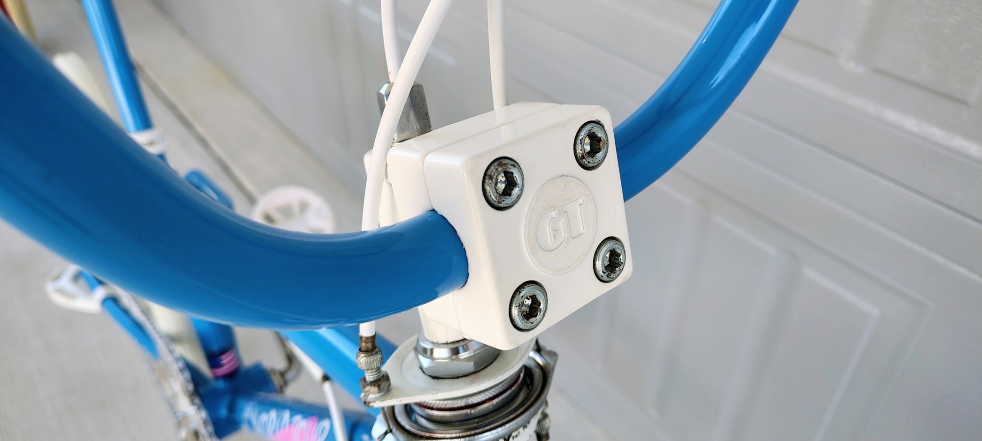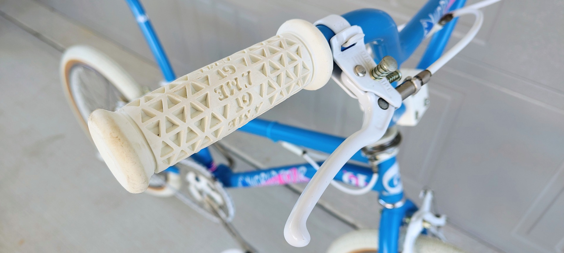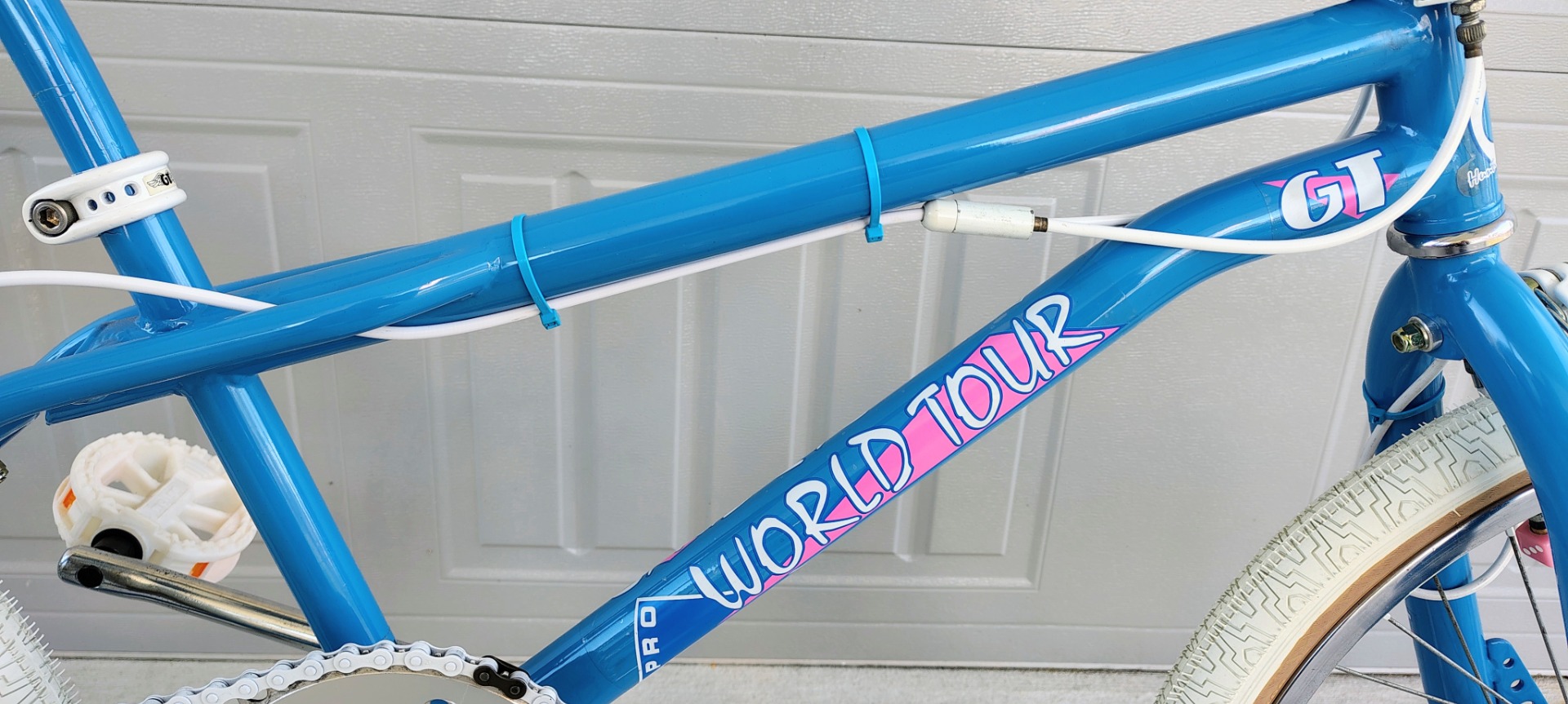 First and foremost : this is a Performer, not a World Tour. Original frame and bars. Repop forks. Fresh powdercoat and new "World Tour" decals. NOS GT anatomical A'ME Grips. NOS Wellgo lollipop pedals. Original Viscount GT 2169 seat, clone UKAI wheels, stamped GT rear standers, stamped two piece GT chainring, NEW Panaracers, OG GT mallet stem ( powdered ), OG one piece GT Power Series cranks, NOS Dia Compe 128 locking levers, Dia Compe calipers, Repop GT pegs.
